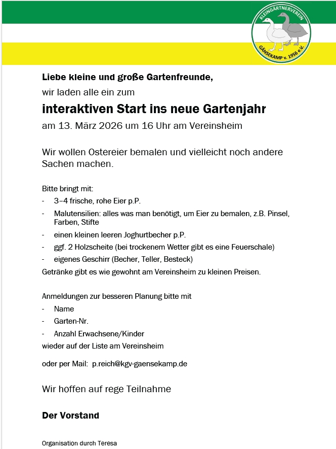 • Datum des Aushangs und die Gartennummer (bestenfalls inkl. Vorname) hilfreich.